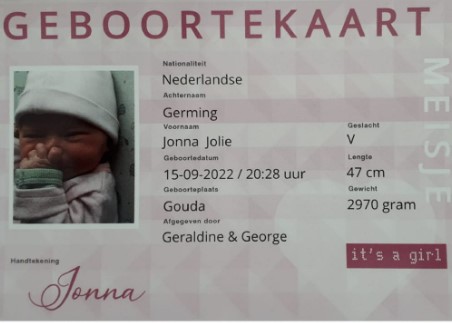 | Geboren | 15-09-2022 Gouda, Zuid-Holland Scan |