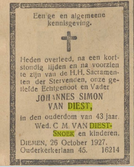 Johannes Simon van Diest overlijden