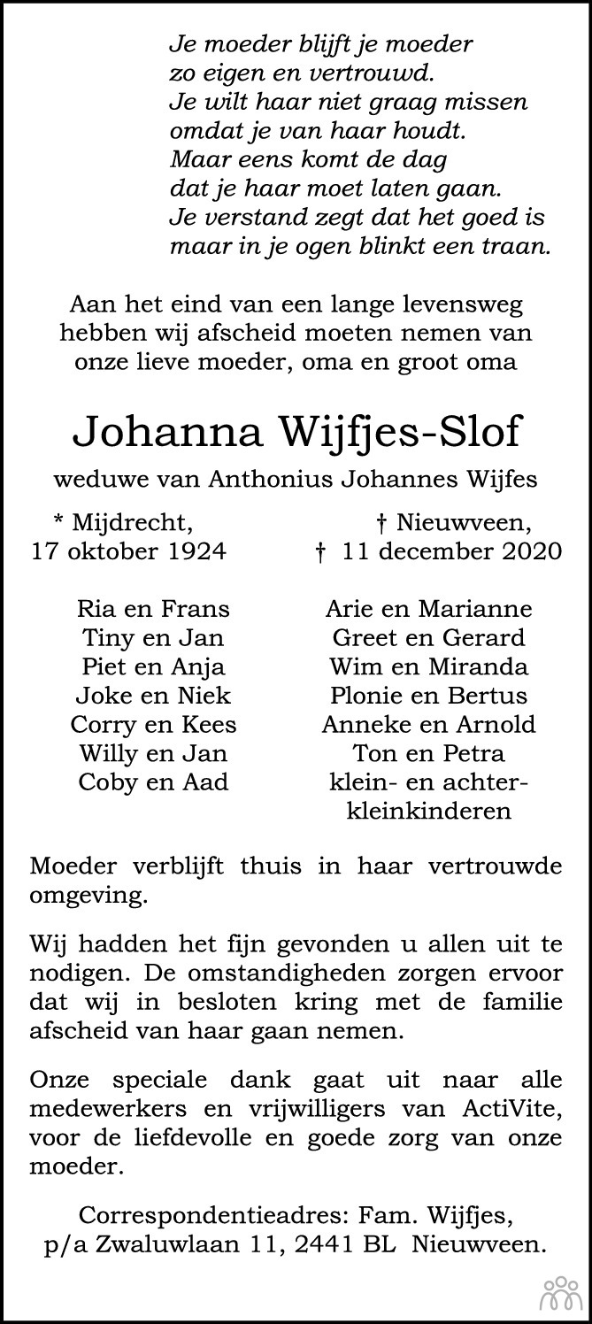 Johanna Slof overlijden