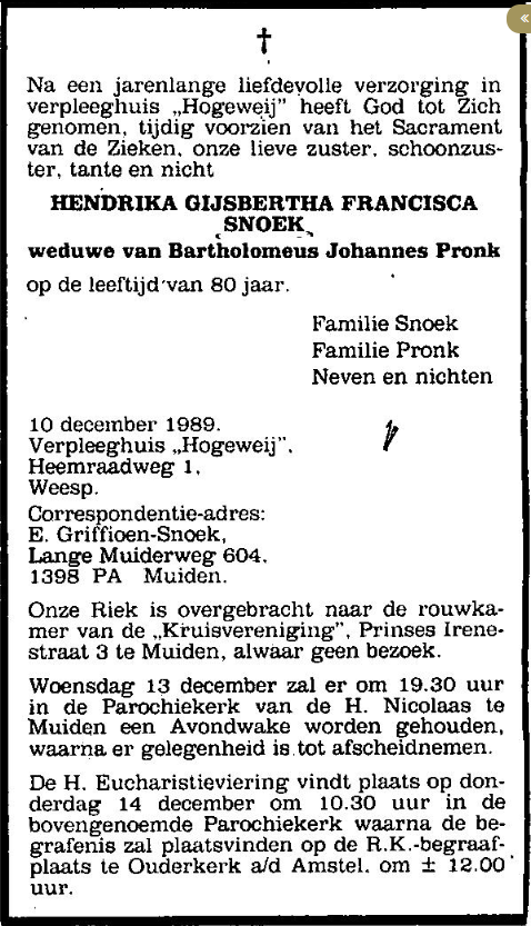 Hendrika Gijsbertha Francisca Snoek overlijden