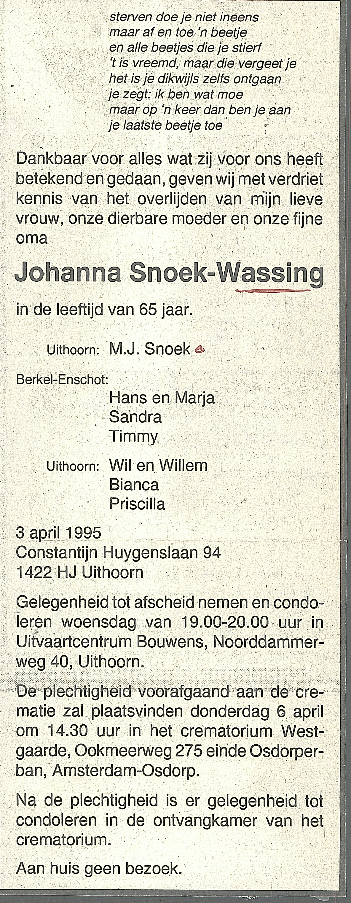 Johanna Wassing begraven